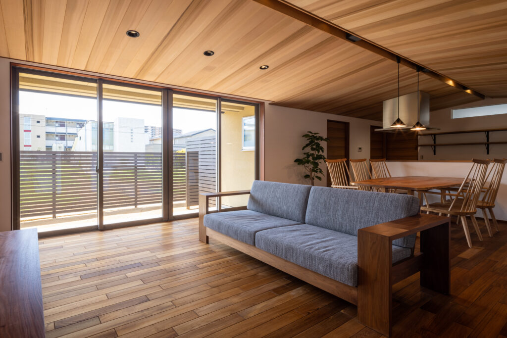 家は無垢の木材と壁天井の漆喰のコントラストをバランス良く施工デザインし、経年変化が味わいを増す広葉樹ならではの風合いや、適材適所に合った木を取り扱うことで劣化を緩めながら快適かつ経済的なお住まいを実現いたしました。